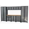 This full-length setup combines wall cabinets for overhead storage, a tall cabinet for larger tools and equipment, plus drawer and floor cabinets for fast, tidy organisation. A robust 30mm wooden worktop creates a durable working surface for repairs, assembly, and maintenance tasks. With fully welded frames across every unit for maximum rigidity, the system delivers long-term reliability and a modern grey-door/black-frame industrial look that fits workshops, garages, and professional work bays.